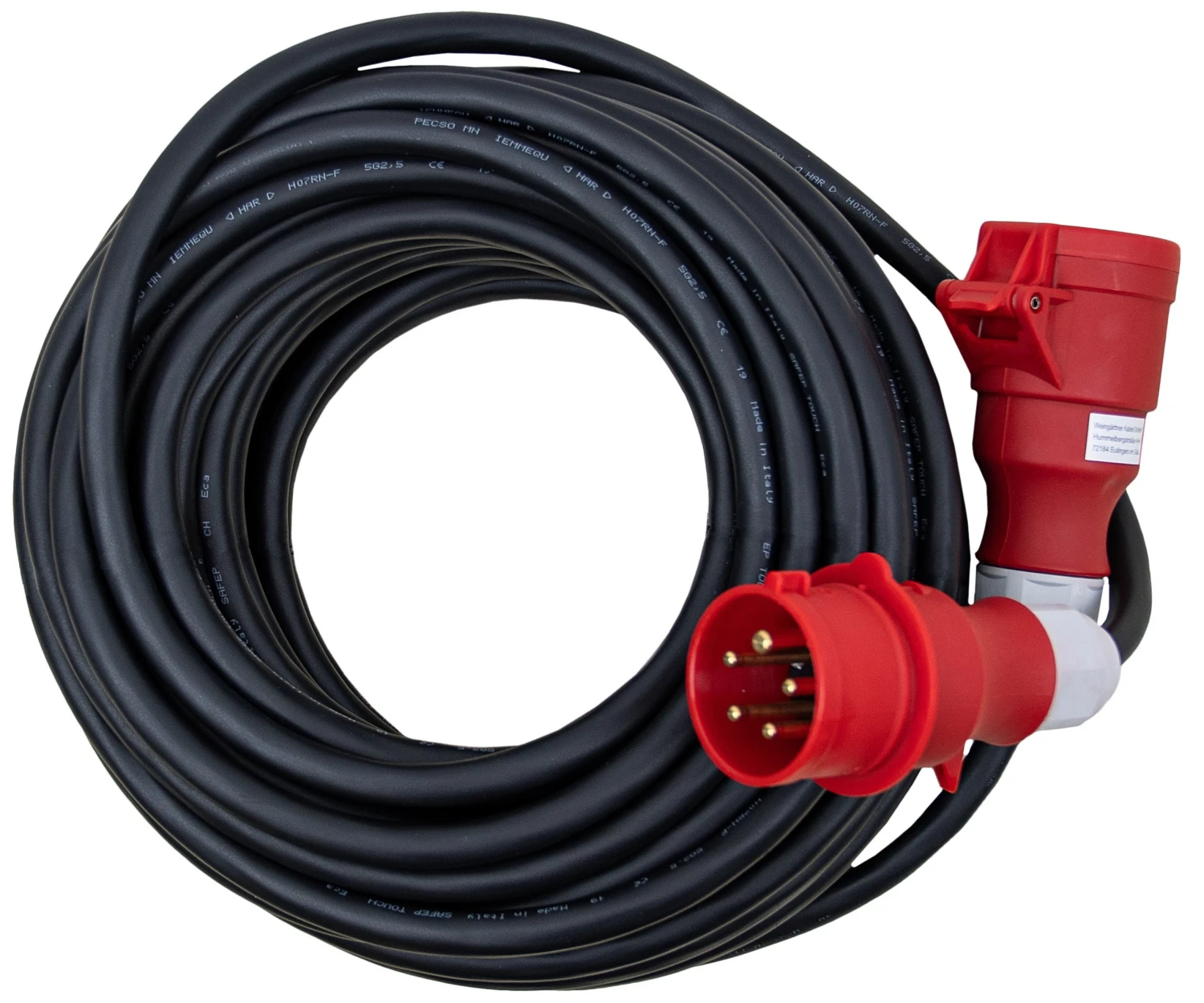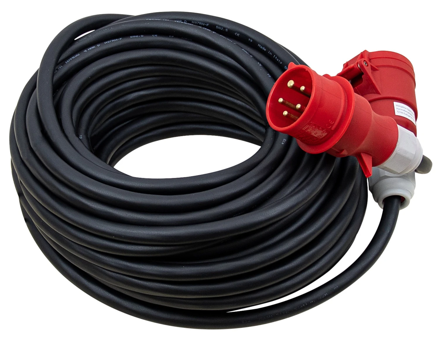 Für Holzspalter und Kreissägen. Eine Seite 16-CEE-Kupplung zum Anschluss der Maschinen. Andere Seite 16-CEE-Stecker zum Anschluss an das Stromnetz. Hochwertige (H07RNF) Ausführung für ständigen Einsatz im Freien, Schutzart IP44. Großer Kabelquerschnitt (5 x 2,5 mm²) zur sicheren Stromversorgung der Antriebsmotoren.