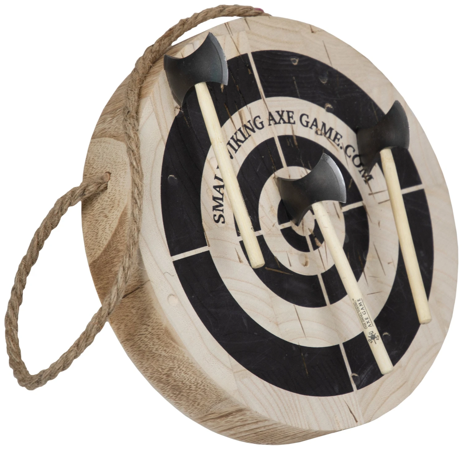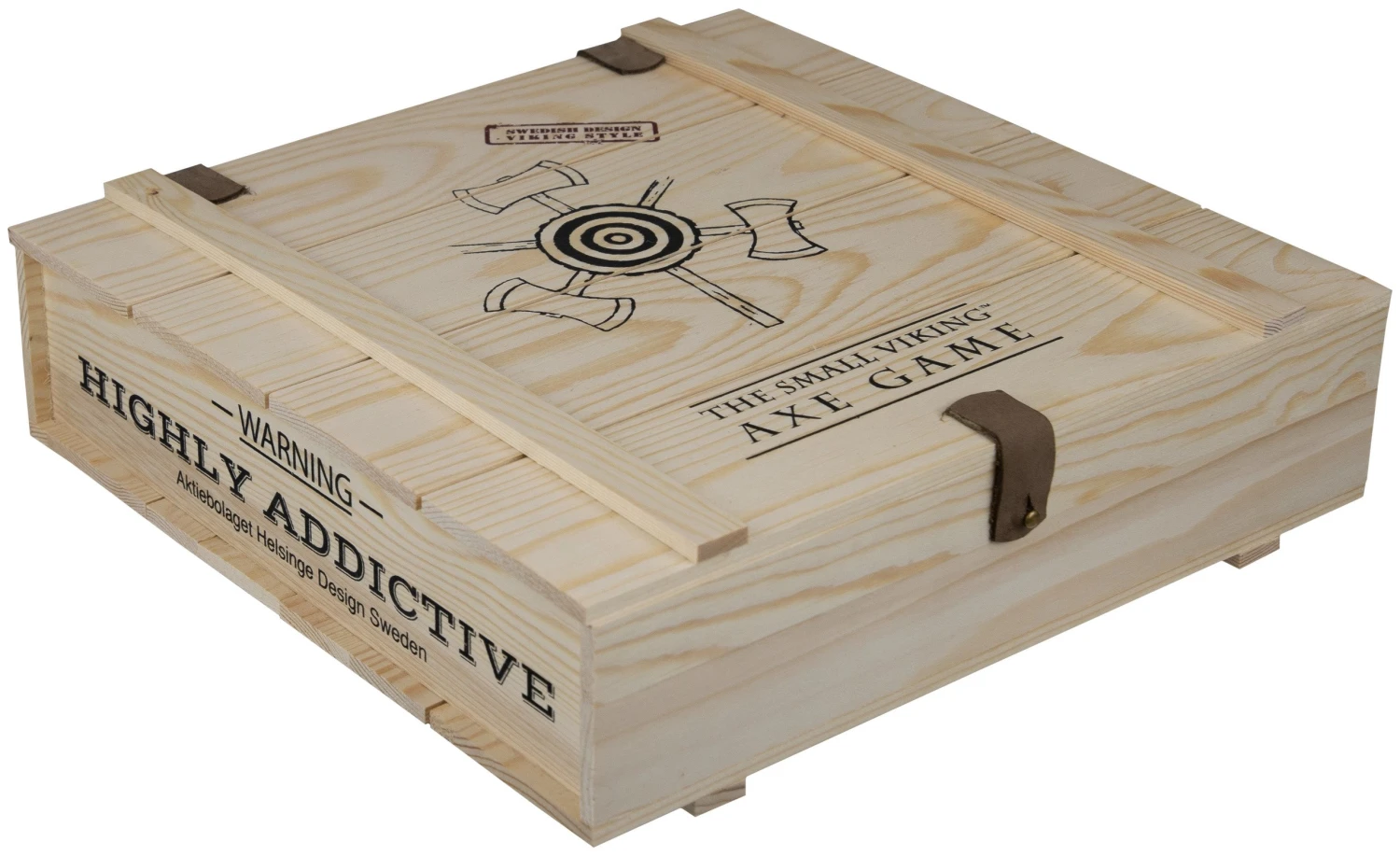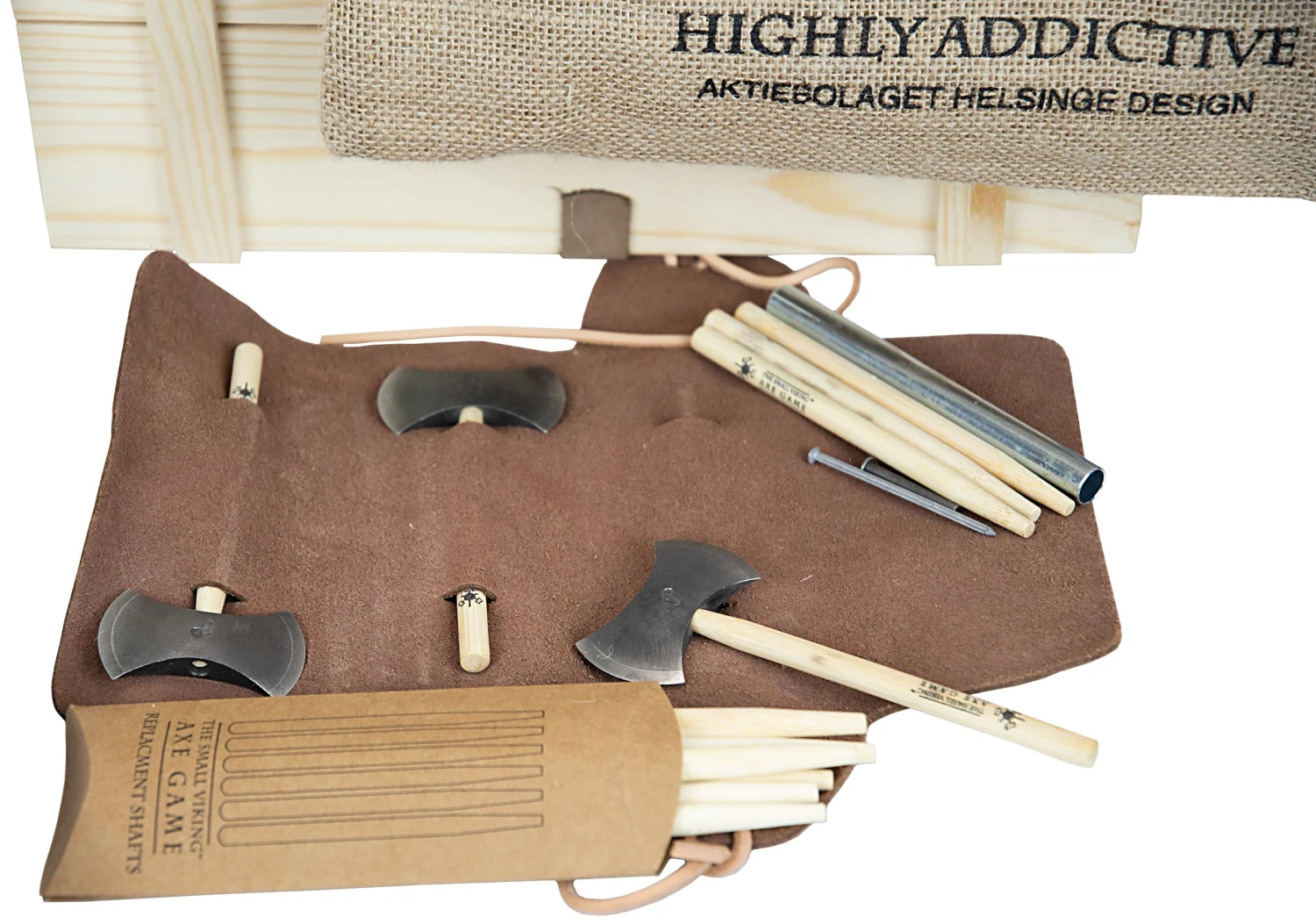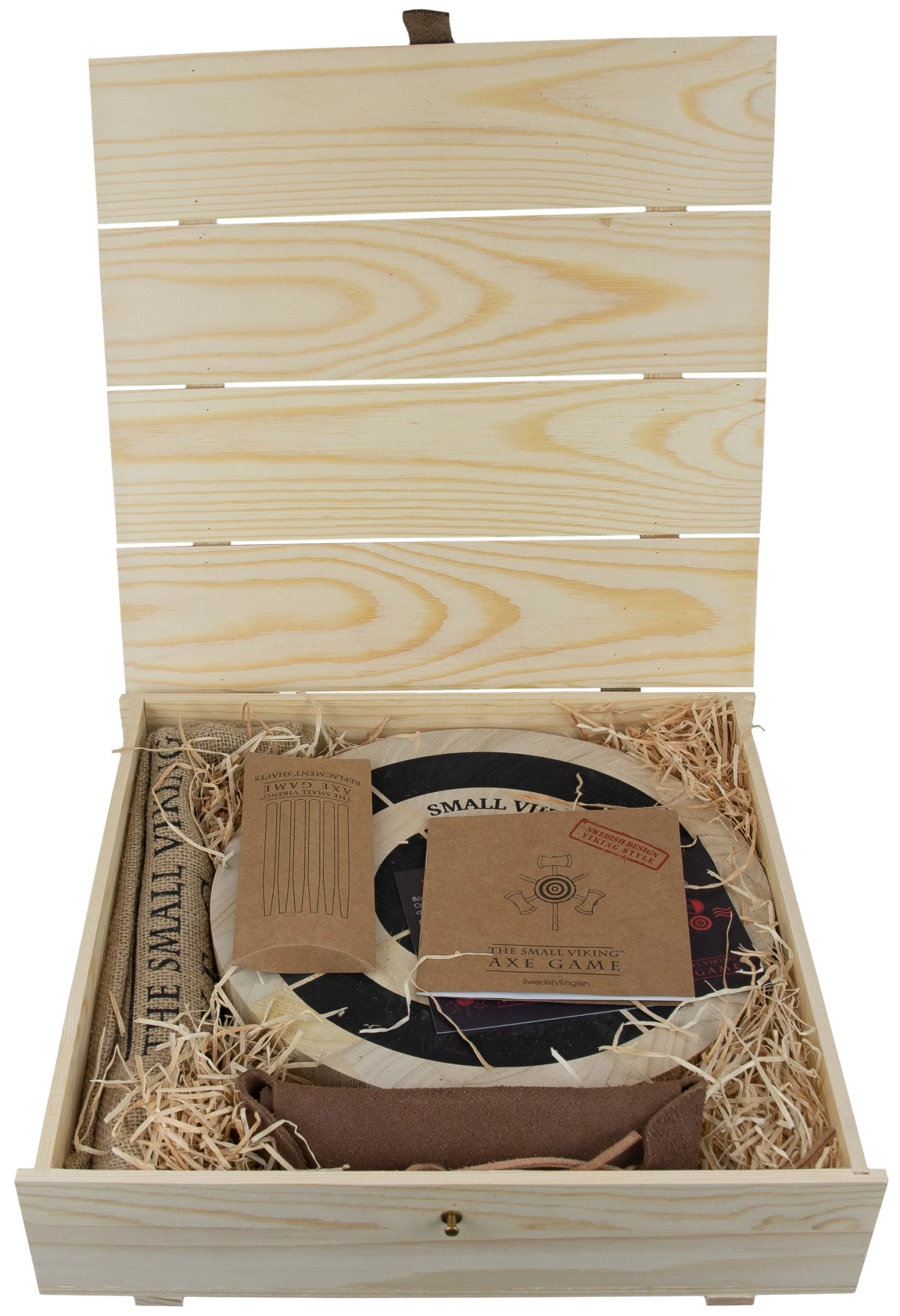 Axtwerfen war und ist besonders in Skandinavien beliebt. Das Axt-Wurfspiel Deluxe-Set enthält alles, um im kleinen Format mit diesem urigen Freizeitspaß beginnen zu können. Die Wurfäxte haben ein Stückgewicht von 45 g und eine Gesamtlänge von ca. 14 cm. Das Axt-Wurfspiel Deluxe-Set enthält drei Wurfäxte sowie weiteres Zubehör in einem praktischen Lederholster. Um eigene Zielscheiben aus Baumscheiben zu erstellen, liegt außerdem eine Sprühschablone bei. Alle Teile finden bei Nichtgebrauch in einer praktischen Holzkiste ihren Platz.
