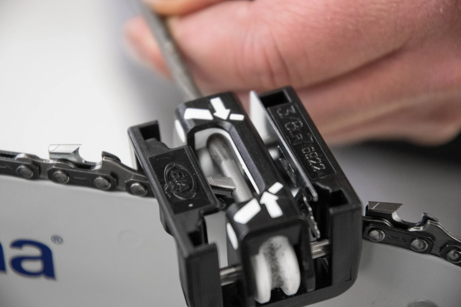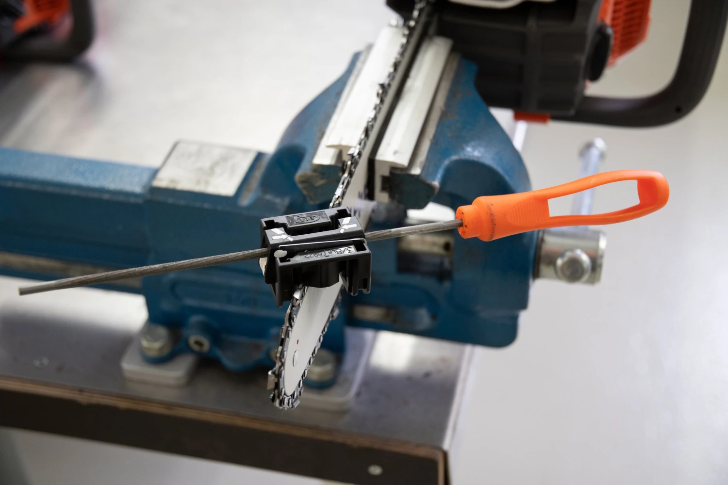 Handliche Lehre zum Schärfen der Kette am Schwert.