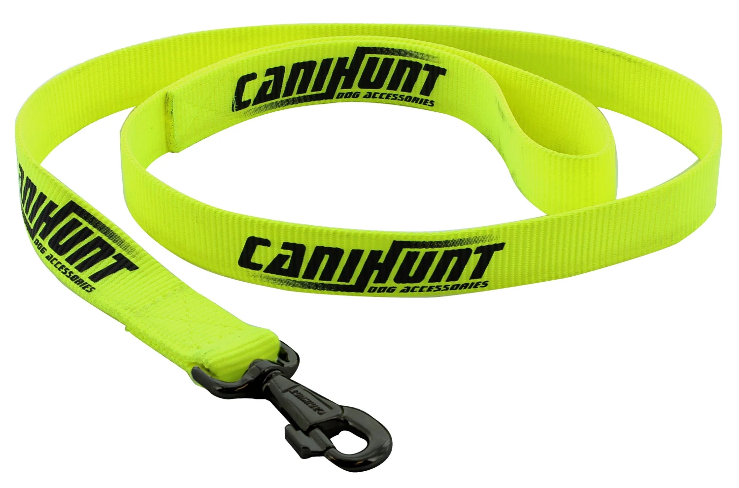 Hundeleine aus 30 mm breitem Polyester-Gurtband mit stabilem Karabinerhaken. Die neongelbe Leine ist weich und gleichzeitig von fester Beschaffenheit. Somit liegt sie gut in der Hand. Aufgrund der neongelben Farbe ist die Hundeleine Canihunt gut sichtbar. Waschbar bei 30 °C.