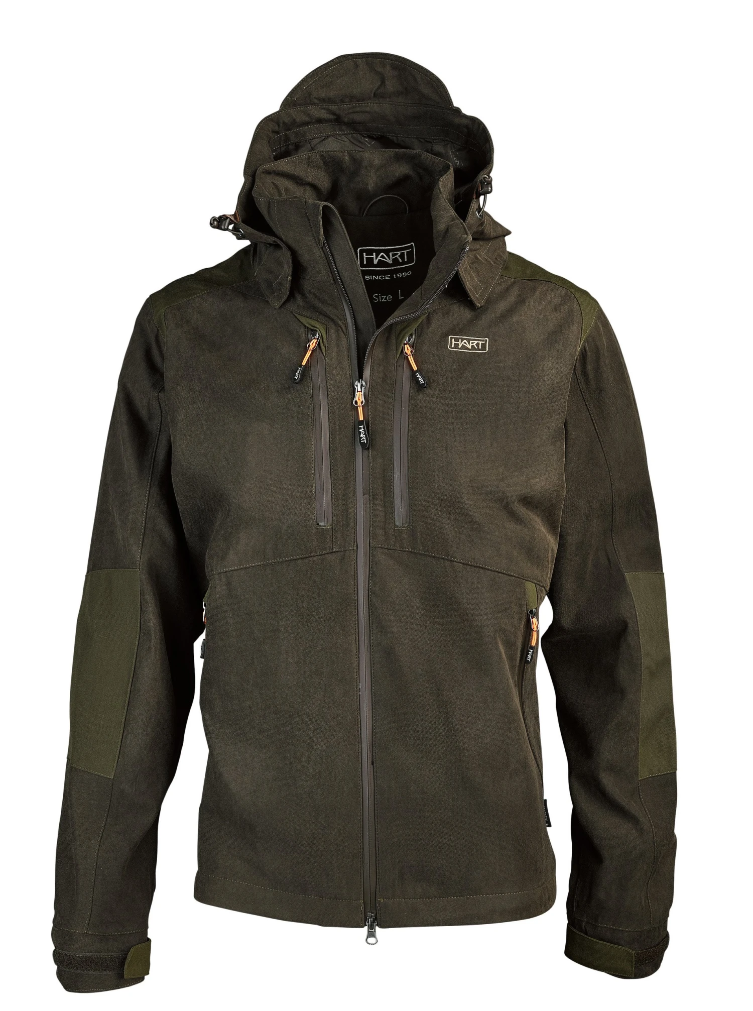 Ausgestattet ist die Hart Herren-Jagdjacke Taunus-J mit zwei Brusttaschen mit Antennenausgang und Gadget für ein Funk- oder GPS-Gerät und rechts mit Schlaufe für Zubehör, zwei Einschubtaschen und einer Hasentasche, jeweils mit Reißverschluss. Innen befinden sich eine Reißverschlusstasche und eine geknöpfte Mesh-Tasche für die Kapuze oder Ähnliches.