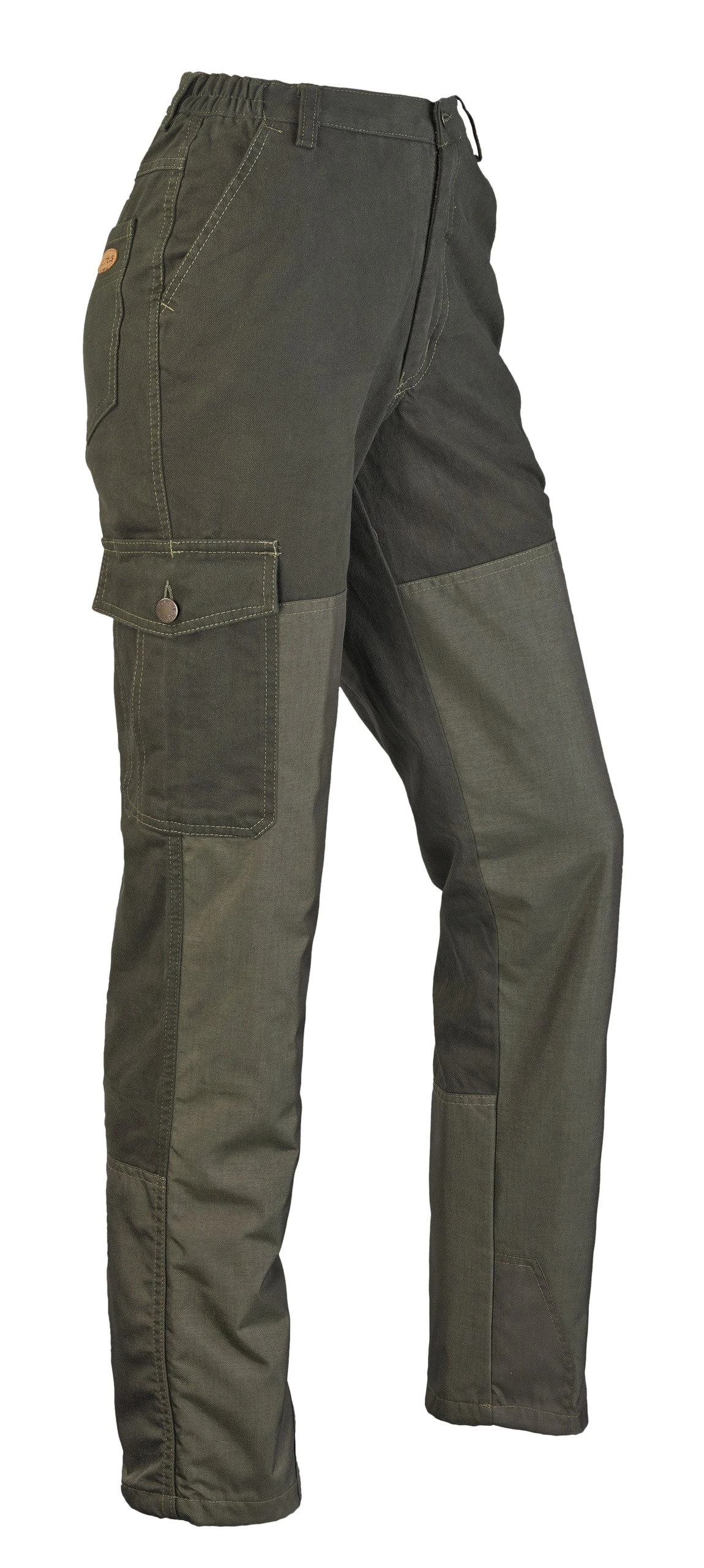 Bequeme Damenhose mit wasserabweisenden, robusten Cordura-Besätzen komplett vorn und hinten im Wadenbereich. Komfortbund mit Gummizugeinsatz, zwei Schub-, eine große Pattentasche mit zusätzlicher Messertasche und zwei Gesäßtaschen.