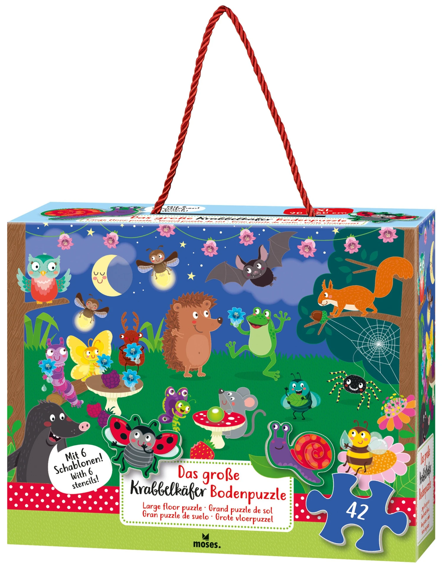 Ein Puzzle-Spaß mit tierischen Gästen: Das Moses Bodenpuzzle XXL zeigt Tiere auf einer Gartenparty und ist dank seiner großen Teile perfekt für die Hände der Kleinen geeignet. Als besonderer Clou sind die 6 größten Teile in Tierform gehalten und können als Schablone zusätzlich auch zum Malen und Basteln benutzt werden. Das ist Puzzeln mit Extra-Spaß!