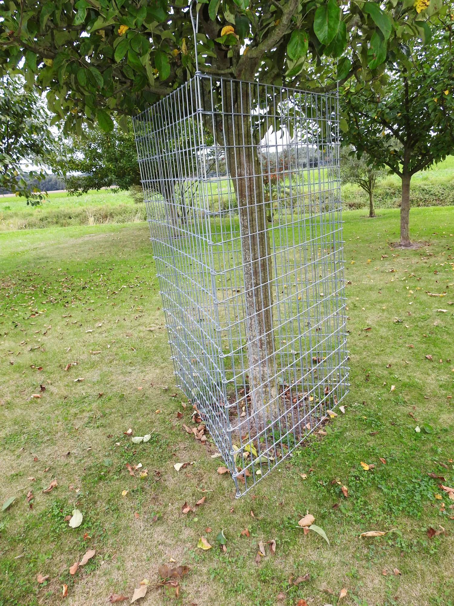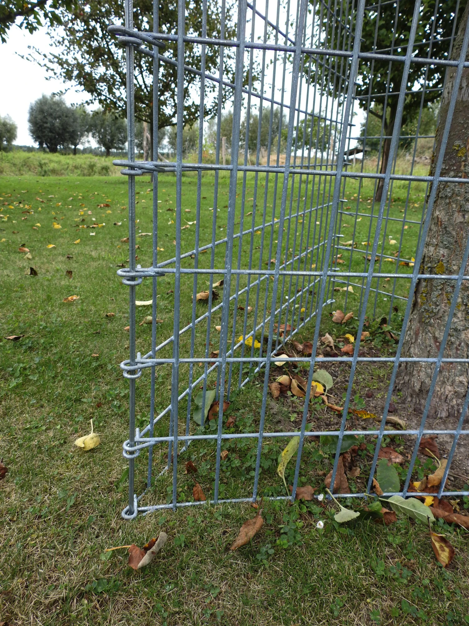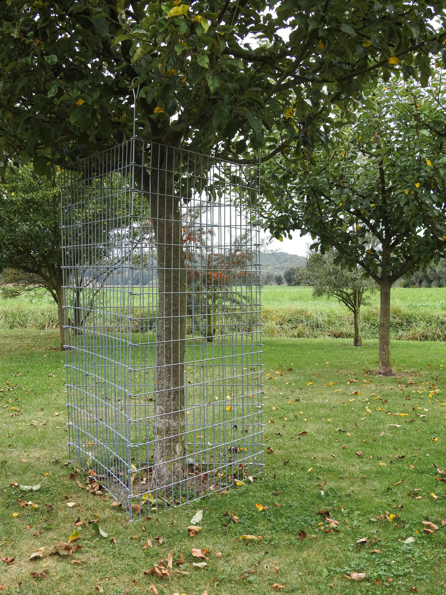 Das PlantaGard Einzelbaumschutz-Drahtelement 150 x 100 cm eignet sich als stammweiser Einzelschutz für den Langzeiteinsatz an größeren Pflanzen. Das stabile Geflecht besteht aus 4,5 mm starkem, verzinktem Galfandraht (ZnAl ,min. 350g/m²) und eignet sich sehr gut als Fege- und Verbissschutz für Sträucher und Obstgehölze auf Nutztierweiden. Die Gittermatten lassen sich platzsparend zwischenlagern und können über lange Zeit wiederverwendet werden. Pro Pflanze genügen 3 Gittermatten für einen stabilen Einzelschutz, bei mehrstämmigen Gehölzen oder Sträuchern können auch mehrere Elemente zusammengestellt werden. Gras im Innenbereich kann nach Anheben der montierten Schutzelemente entfernt werden.