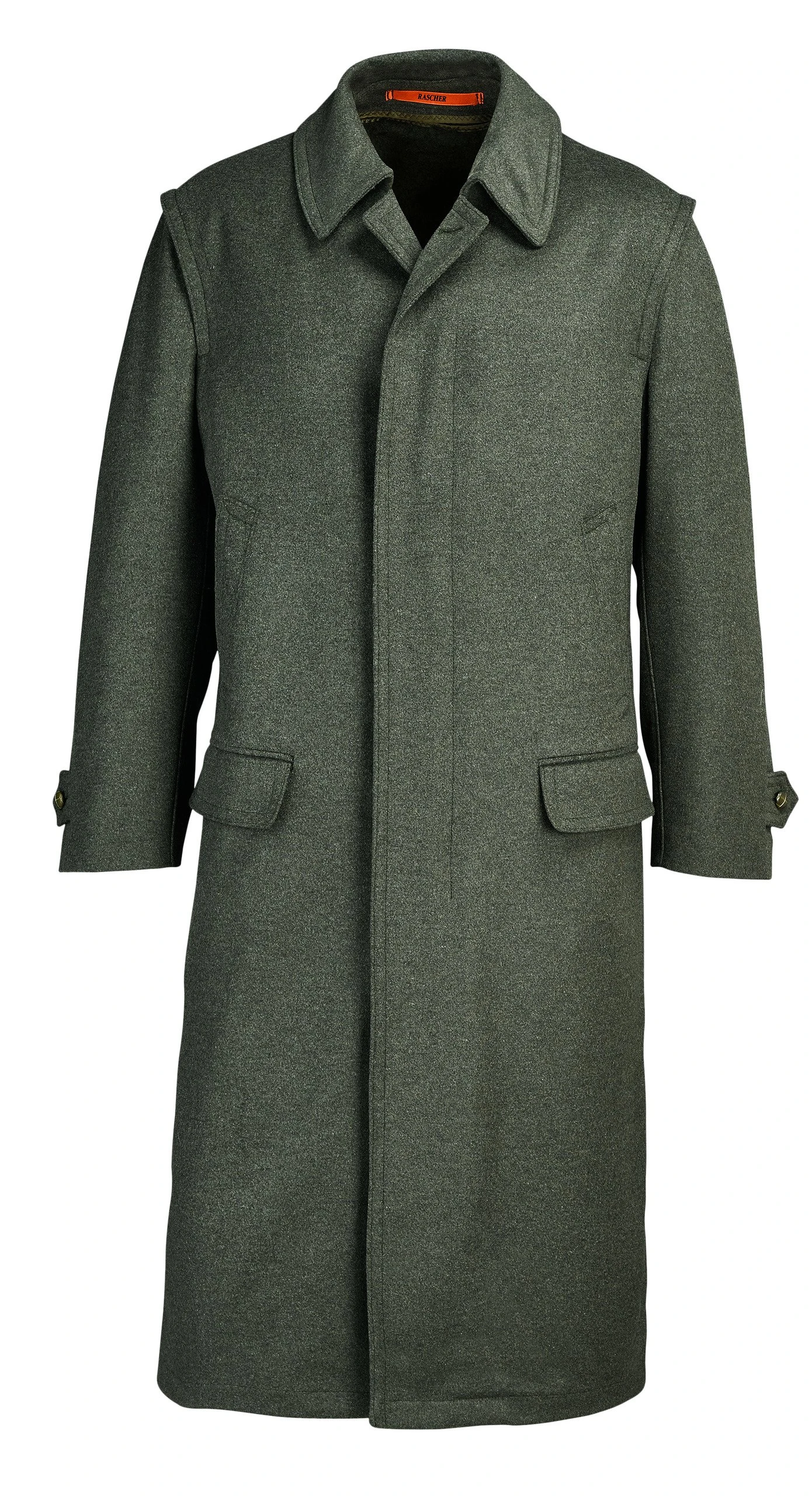 Zwei gefütterte Einschubtaschen, zwei abgedeckte Fronttaschen, zwei Innentaschen sowie eine Patten-Innentasche mit Knopf machen den Rascher Hubertusmantel komplett.