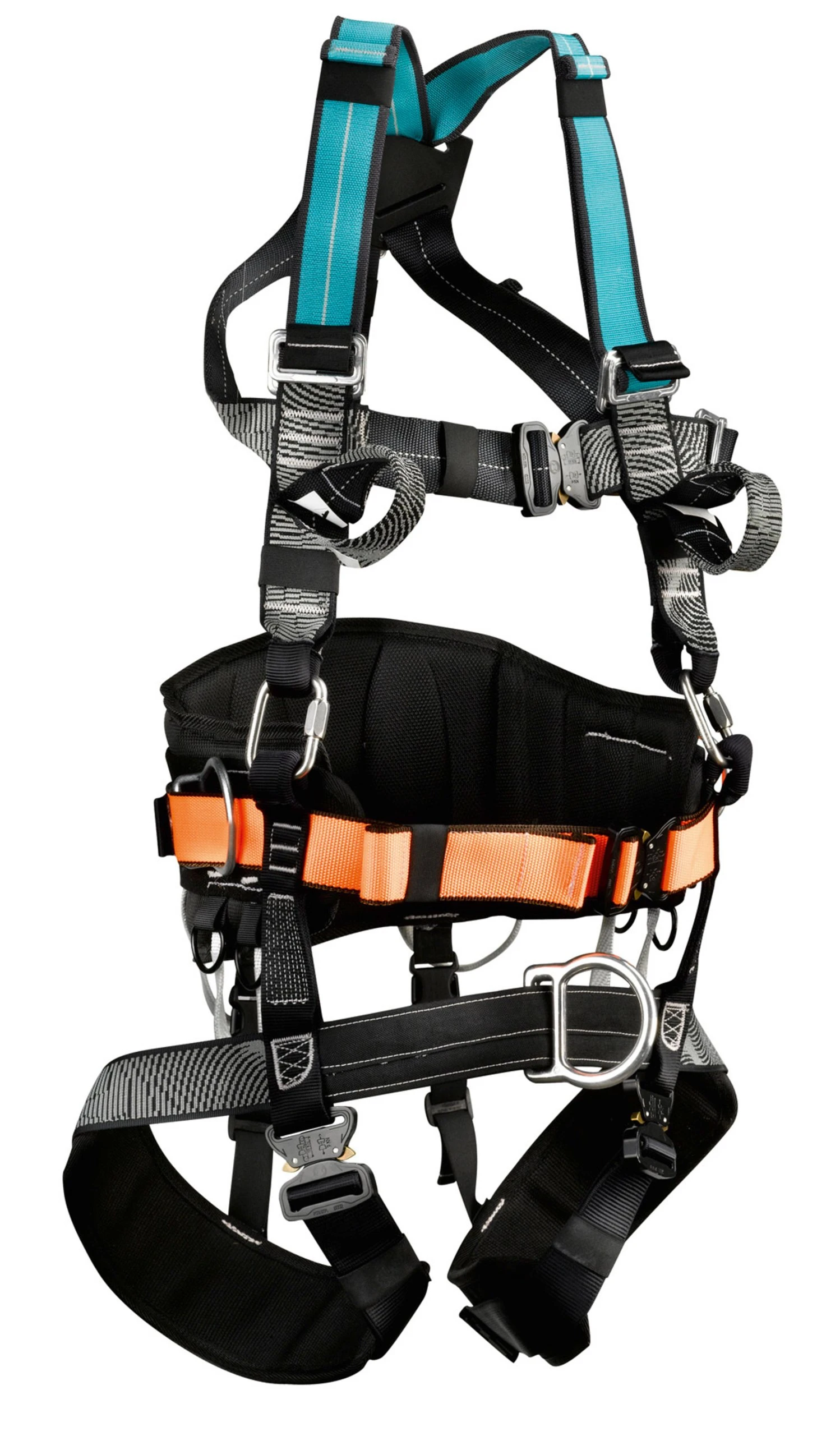 Das An- und Ablegen des Auffanggurtes ist durch die Steckschlösser an den Bauch- und Beingurten besonders einfach. Die Materialschlaufen aus Dyneemaband und die sechs geschweißten, hochbelastbaren D-Ringe runden den Gurt in seiner Funktionalität ab.