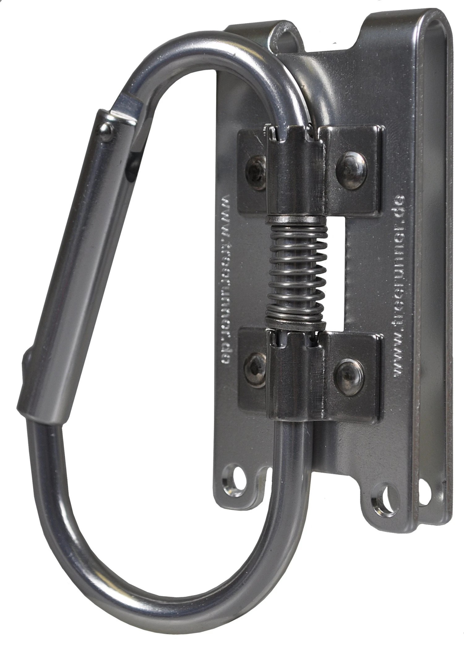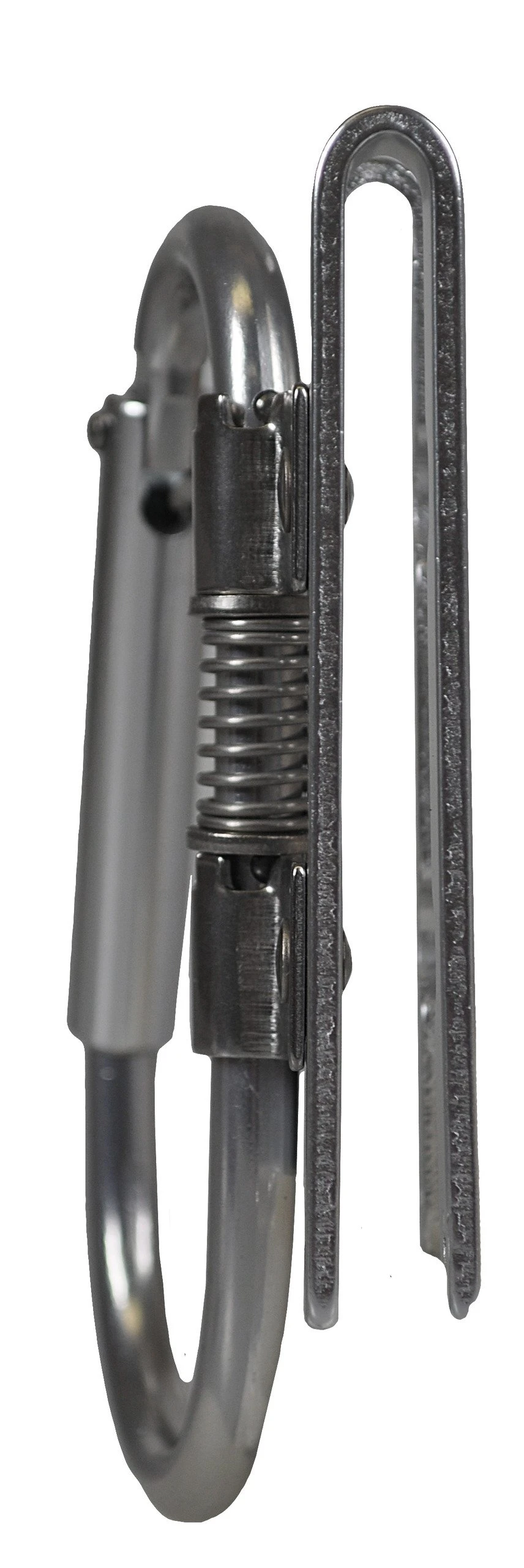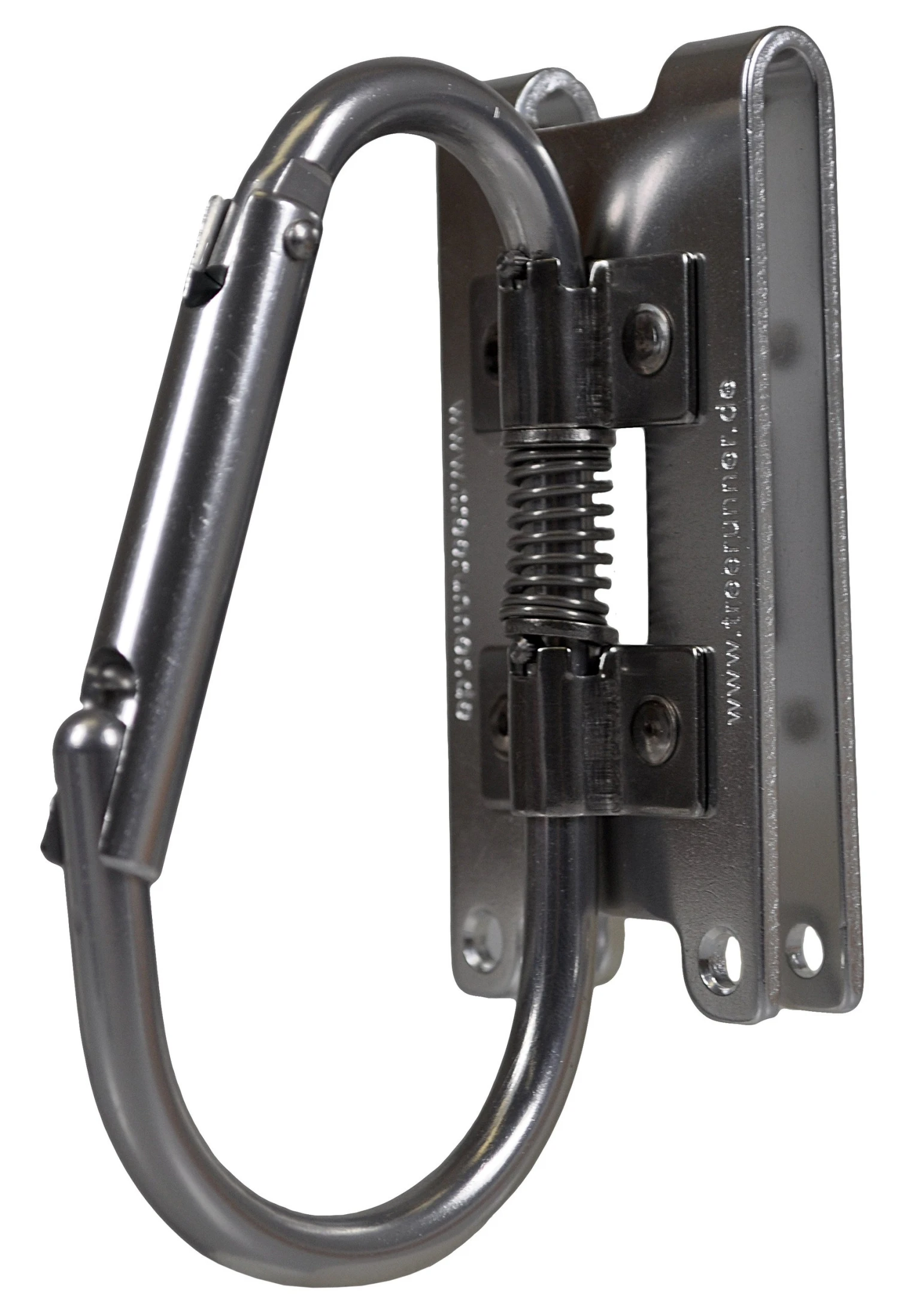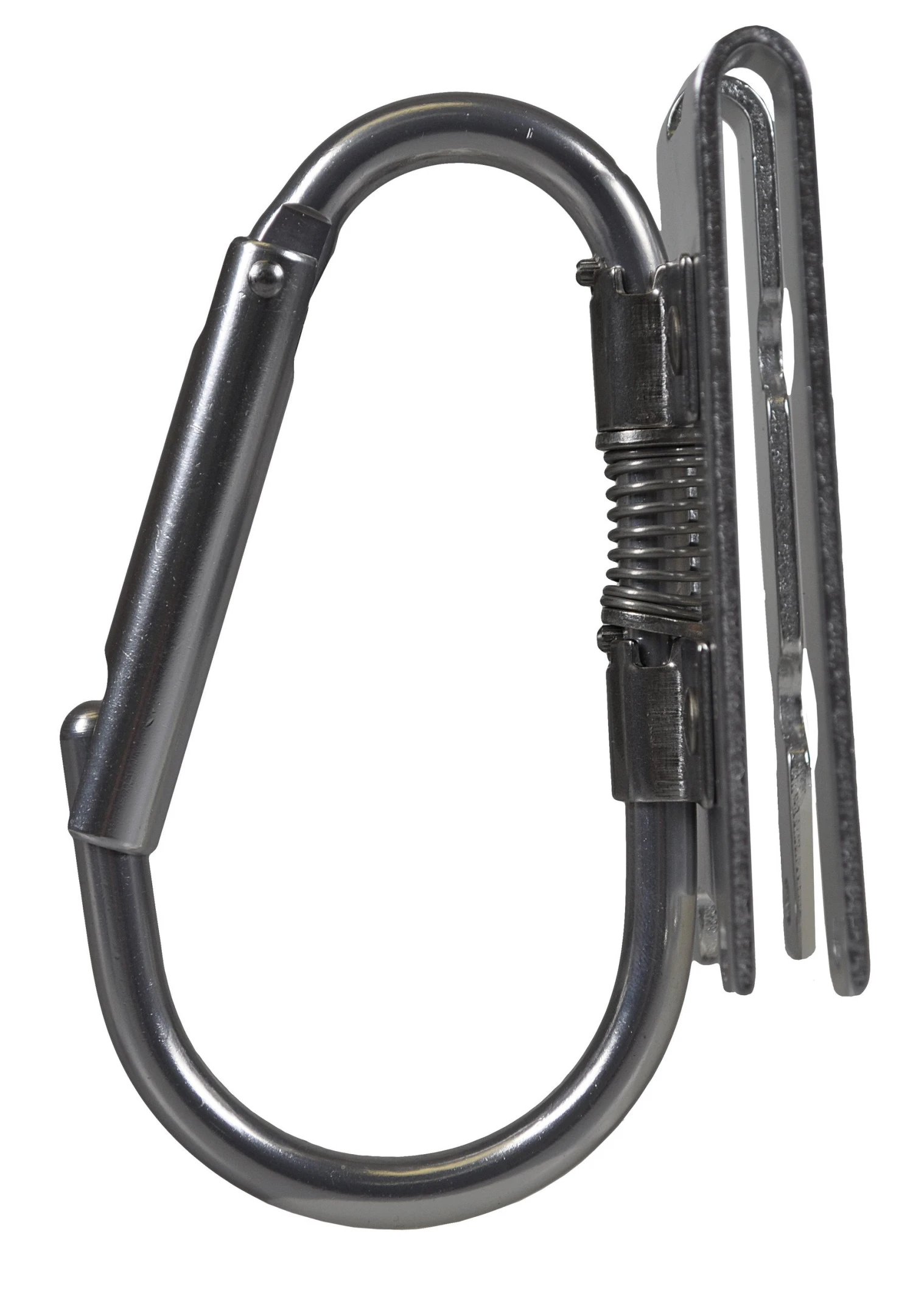 Klappkarabiner für Gurte mit bis zu 80 mm Gurtband. Der Materialkarabiner rastet in Querstelllung ein, so dass Motorsägen und Geräte leicht eingehängt werden können. Bei Nichtgebrauch lässt sich der Motorsägenhaken flach an den Gürtel klappen.