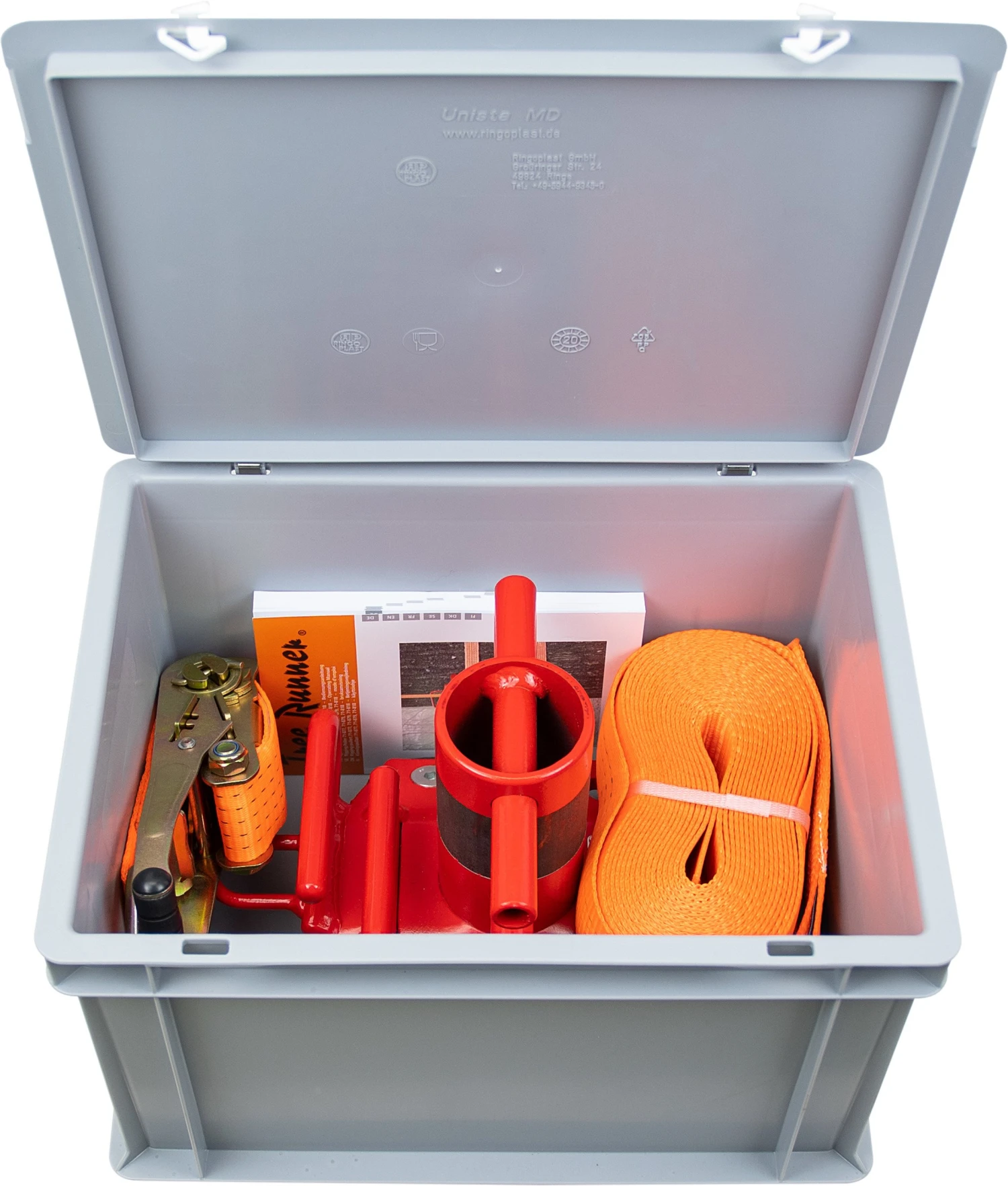 Durch die Seilführung wird das einlaufende Seil von oben bis zu den Seiten sicher geführt. Die vier, 70 mm Ø großen Gummiteller schonen die Rinde optimal. Das Bremsrohr hat einen Durchmesser von 76 mm und eine Stärke von 5 mm. Das Gewicht beträgt 5,8 kg.