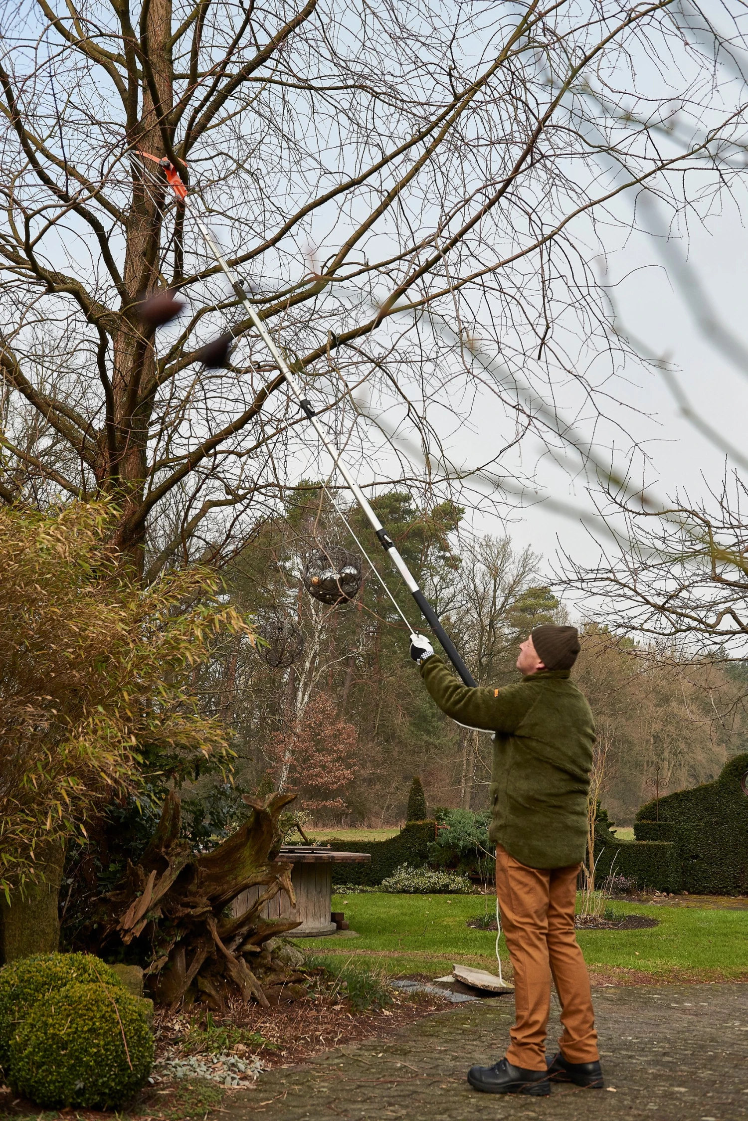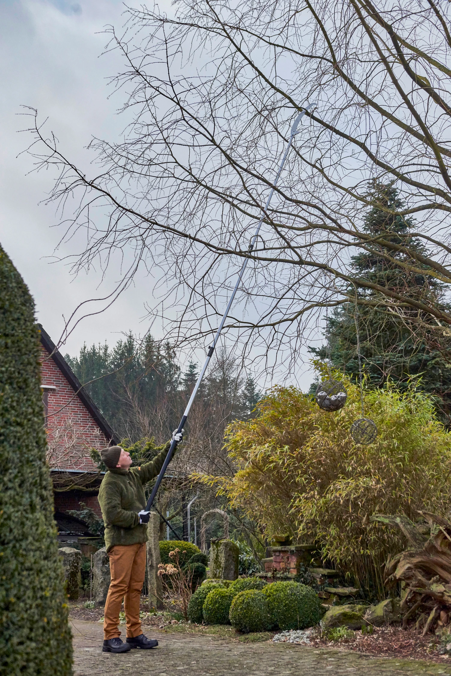 Teleskopgestänge aus Aluminium-Ovalrohr. Die Sicherung erfolgt durch Rastbolzen und Klemmschrauben. Das untere Gestängerohr ist für guten Grip, auch bei Nässe, teilweise mit gummiertem Kunststoff überzogen. Das Tri Saw Lock25 Aluminium-Teleskopgestänge ist besonders steif und schwingungsarm durch ein zusätzlich eingezogenes U-Profil im oberen Gestängerohr. Das Aus- und Einschieben des Gestänges funktioniert wie folgt: Zuerst wird die Klemmschraube gelöst. Anschließend wird der Rastbolzen zurückgedrückt und so gehalten. Nun kann das Gestänge auf die gewünschte Länge ein- und ausgeschoben werden. Wenn der Bolzen eingerastet und die Klemmschraube wieder festgedreht ist, so ist das Gestänge zug- und druckfest fixiert. Achtung: Aluminium ist elektrisch leitend.