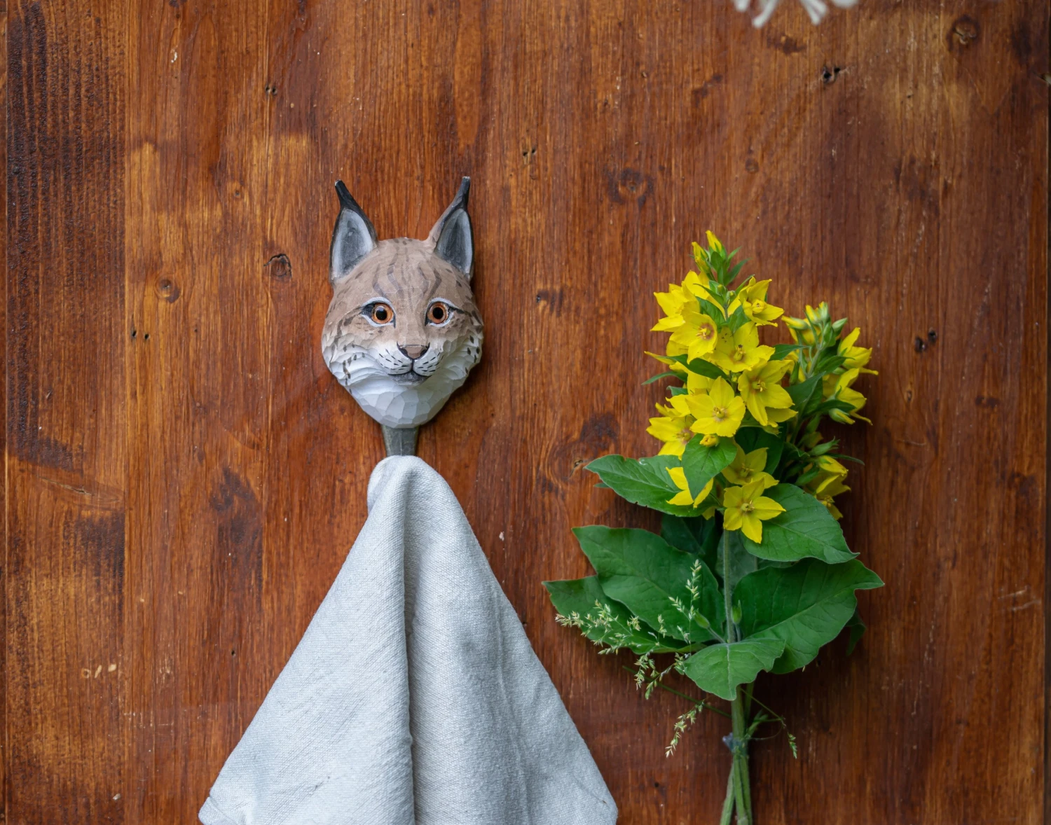 Der Wandhaken Luchs ist ein funktionaler Hingucker für Kleider, Handtücher & Co. Der Haken selbst ist aus robustem Metall, während das Tiermotiv per Hand aus Holz geschnitzt wird. Die liebevolle Handbemalung haucht dem Luchs Leben ein – dafür werden wasserbeständige, umweltfreundliche Farben verwendet.