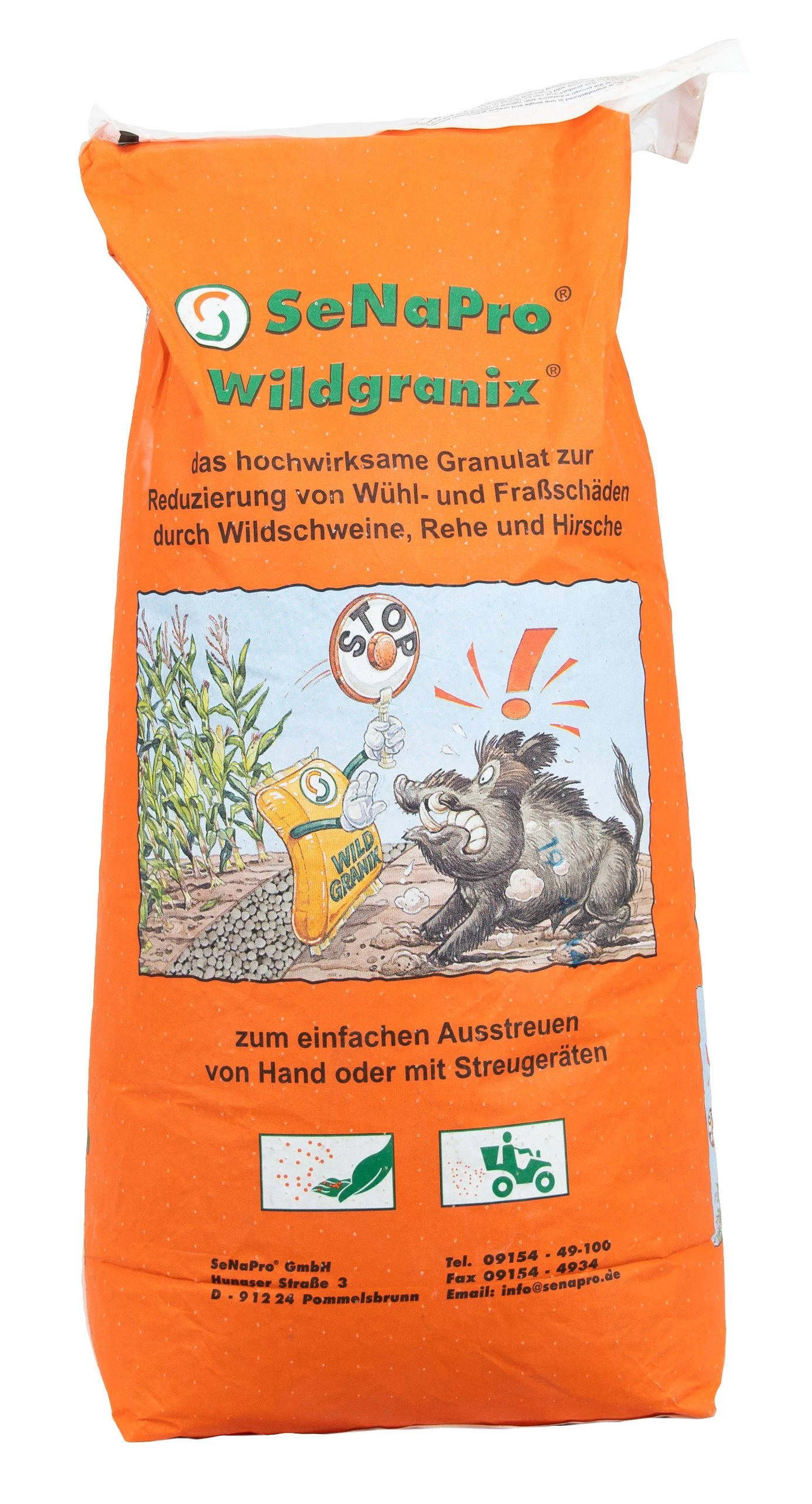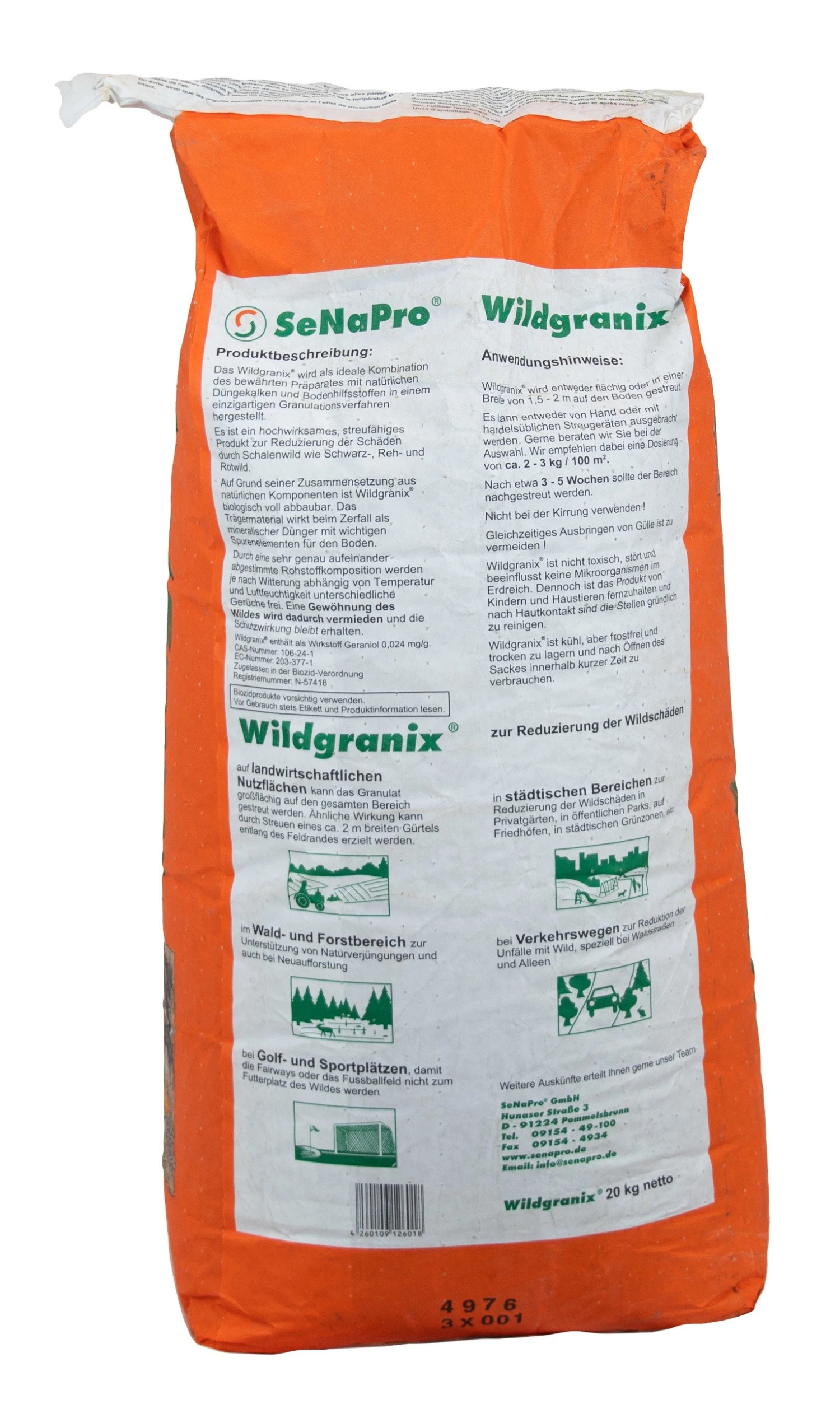 Wildgranix ist ein hochwirksames, streufähiges Granulat zur Reduzierung der Schäden durch Schwarz-, Reh- und Rotwild, sowie Hase und Kaninchen. Durch eine sehr genau aufeinander abgestimmte Rohstoffkomposition werden je nach Witterung abhängig von Temperatur und Luftfeuchtigkeit unterschiedliche Gerüche frei. Eine Gewöhnung des Wildes wird dadurch vermieden und die Schutzwirkung bleibt über Wochen erhalten.